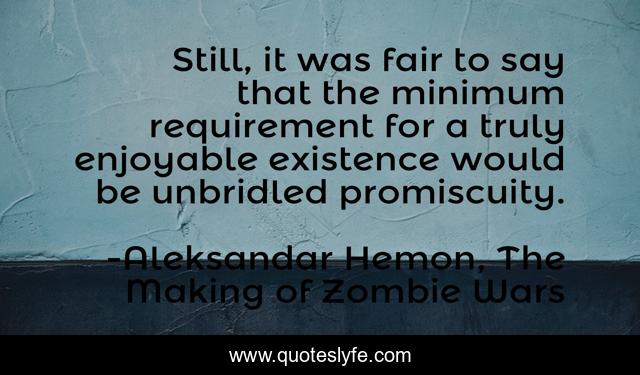 This page presents the quote "Still, it was fair to say that the minimum requirement for a truly enjoyable existence would be unbridled promiscuity.". Author of this quote is Aleksandar Hemon, The Making of Zombie Wars. .