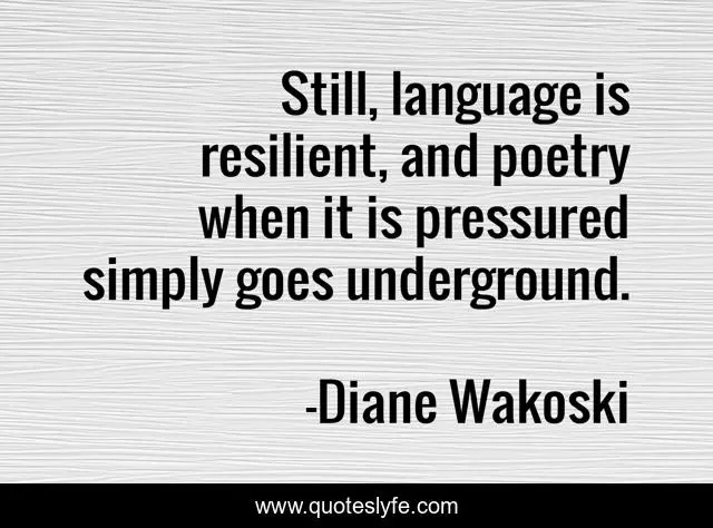 This page presents the quote "Still, language is resilient, and poetry when it is pressured simply goes underground.". Author of this quote is Diane Wakoski. This quote is about resilient, still, language,.