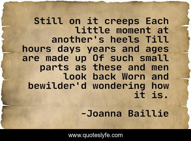 "Joanna Baillie Quotes." Quoteslyfe.com, 2025. Fri. 05 Dec. 2025. <https://www.quoteslyfe.com/quote/Still-on-it-creeps-Each-little-moment-271802>.