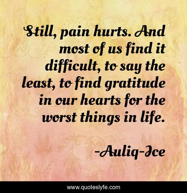 This page presents the quote "Still, pain hurts. And most of us find it difficult, to say the least, to find gratitude in our hearts for the worst things in life.". Author of this quote is Auliq-Ice. This quote is about pain, regrets,.