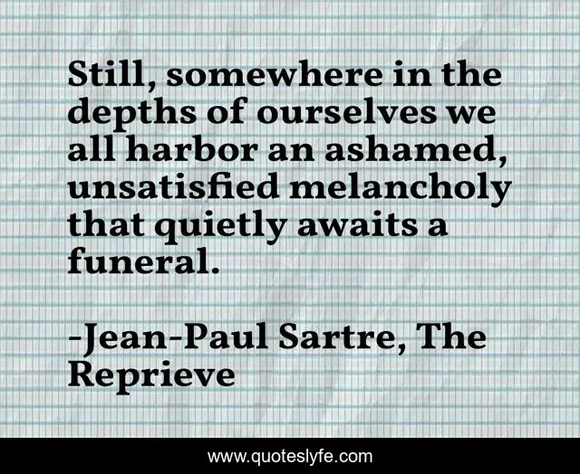 This page presents the quote "Still, somewhere in the depths of ourselves we all harbor an ashamed, unsatisfied melancholy that quietly awaits a funeral.". Author of this quote is Jean-Paul Sartre, The Reprieve. This quote is about melancholy, existentialism, funeral, sadness, sartre, existential, depression,.