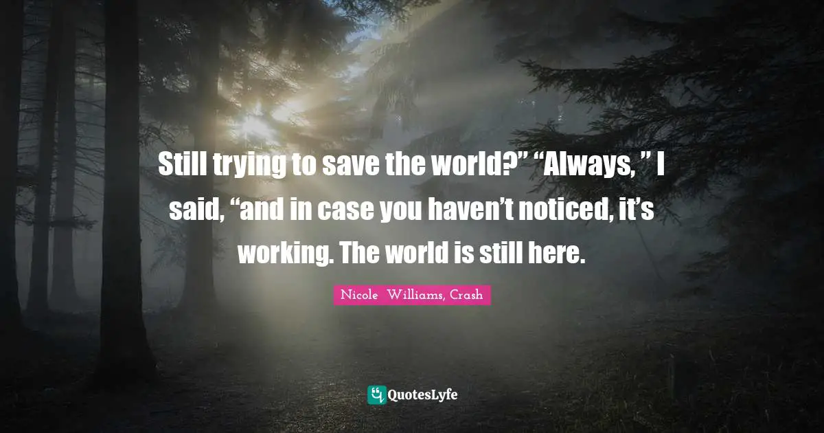 "Nicole Williams, Crash Quotes." Quoteslyfe.com, 2025. Fri. 26 Dec. 2025. <https://www.quoteslyfe.com/quote/Still-trying-to-save-the-world-Always-149088>.