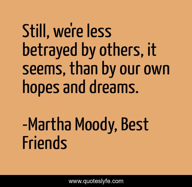 This page presents the quote "Still, we're less betrayed by others, it seems, than by our own hopes and dreams.". Author of this quote is Martha Moody, Best Friends. This quote is about hopes-and-dreams, betrayal,.