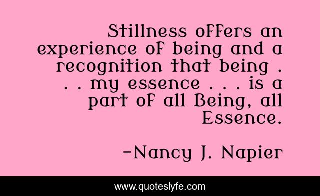 This page presents the quote "Stillness offers an experience of being and a recognition that being . . . my essence . . . is a part of all Being, all Essence.". Author of this quote is Nancy J. Napier. This quote is about being, essence, meditation,.