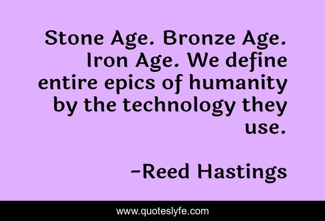 This page presents the quote "Stone Age. Bronze Age. Iron Age. We define entire epics of humanity by the technology they use.". Author of this quote is Reed Hastings. This quote is about stone, technology, humanity,.