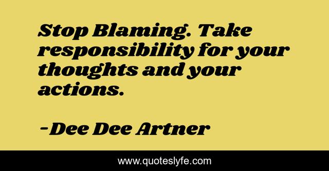 This page presents the quote "Stop Blaming. Take responsibility for your thoughts and your actions.". Author of this quote is Dee Dee Artner. This quote is about lifestyle, success, business, people, millionaire-focus, actions, entrepreneurship, behaviour, attitude,.