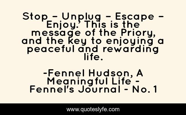 "Fennel Hudson, A Meaningful Life - Fennel's Journal - No. 1 Quotes." Quoteslyfe.com, 2025. Sat. 06 Dec. 2025. <https://www.quoteslyfe.com/quote/Stop-Unplug-Escape-Enjoy-This-is-the-245457>.