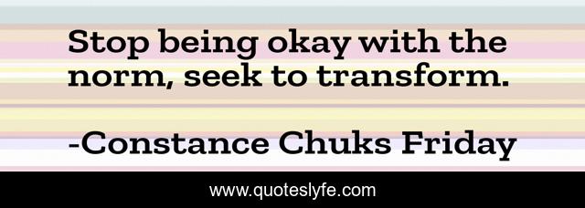 This page presents the quote "Stop being okay with the norm, seek to transform.". Author of this quote is Constance Chuks Friday. This quote is about be, life, okay, normal, being, change-your-life, transform, norm, change-the-world,.
