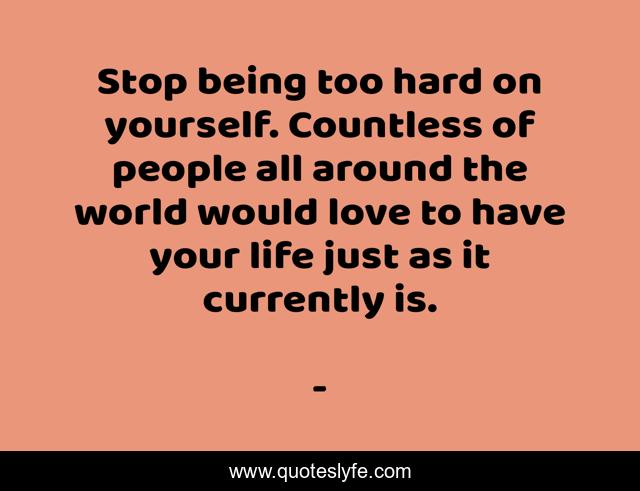 This page presents the quote "Stop being too hard on yourself. Countless of people all around the world would love to have your life just as it currently is.". Author of this quote is . This quote is about edmond-mbiaka, don-t-be-hard-on-yourself, love-your-life, your-life,.