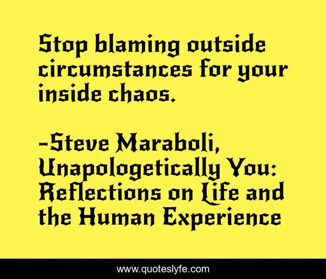 This page presents the quote "Stop blaming outside circumstances for your inside chaos.". Author of this quote is Steve Maraboli, Unapologetically You: Reflections on Life and the Human Experience. This quote is about confidence, success, positive, motivational, chaos, optimistic, inspirational, enthusiasm, circumstances,.
