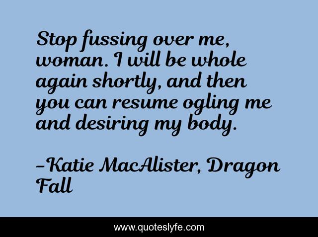 This page presents the quote "Stop fussing over me, woman. I will be whole again shortly, and then you can resume ogling me and desiring my body.". Author of this quote is Katie MacAlister, Dragon Fall. This quote is about paranormal-romance, dragons,.