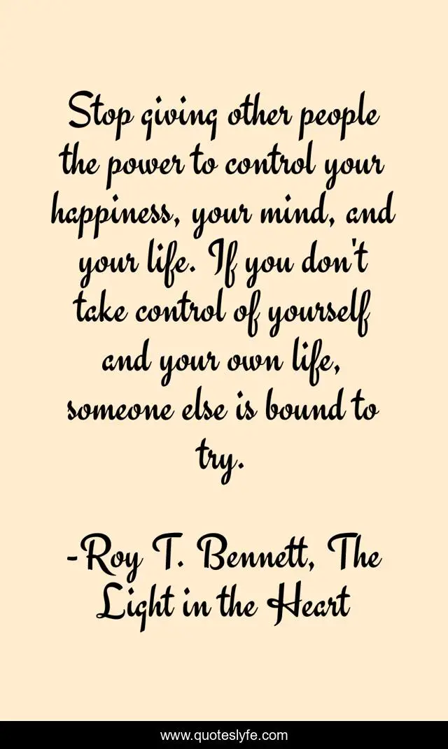 This page presents the quote "Stop giving other people the power to control your happiness, your mind, and your life. If you don't take control of yourself and your own life, someone else is bound to try.". Author of this quote is Roy T. Bennett, The Light in the Heart. This quote is about motivation, inspire, mind, optimistic, inspirational-life, life-and-living, happiness, living, inspiring,.
