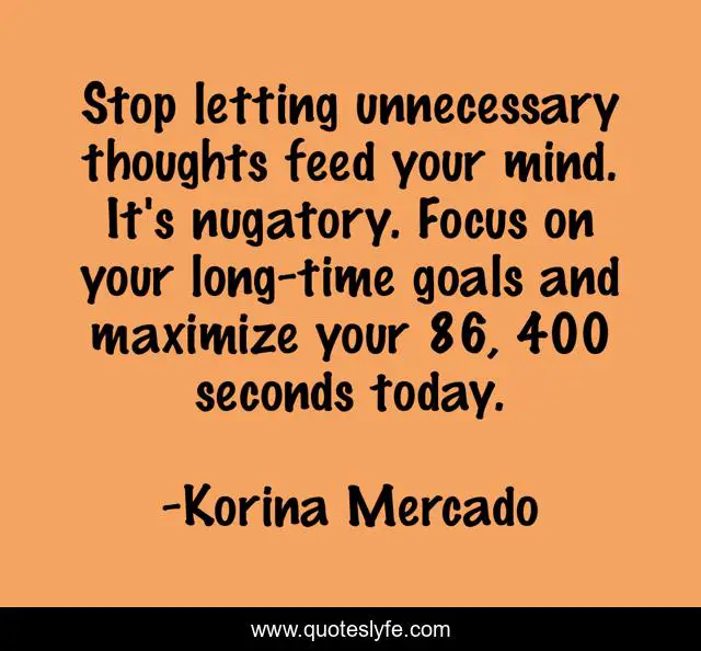 This page presents the quote "Stop letting unnecessary thoughts feed your mind. It's nugatory. Focus on your long-time goals and maximize your 86, 400 seconds today.". Author of this quote is Korina Mercado. This quote is about life, dream-big, goals-in-life, focus-on-your-dreams, stress-diary, beautiful-writing, happiness-positive-outlook, frustration, life-lessons-value-of-life-truth,.