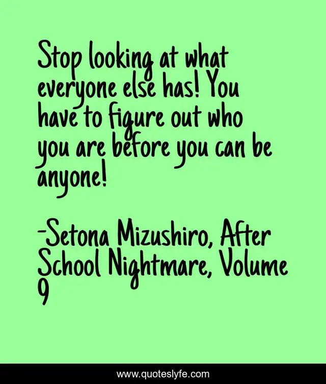 This page presents the quote "Stop looking at what everyone else has! You have to figure out who you are before you can be anyone!". Author of this quote is Setona Mizushiro, After School Nightmare, Volume 9. This quote is about teen, adolescence, self-esteem,.