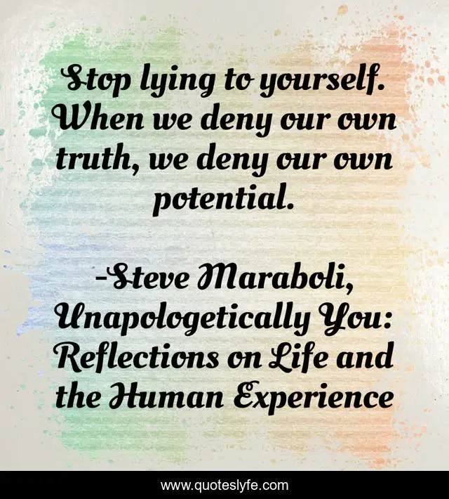 This page presents the quote "Stop lying to yourself. When we deny our own truth, we deny our own potential.". Author of this quote is Steve Maraboli, Unapologetically You: Reflections on Life and the Human Experience. This quote is about deny, honesty, success, self-deception, potential, lying, truth, happiness,.