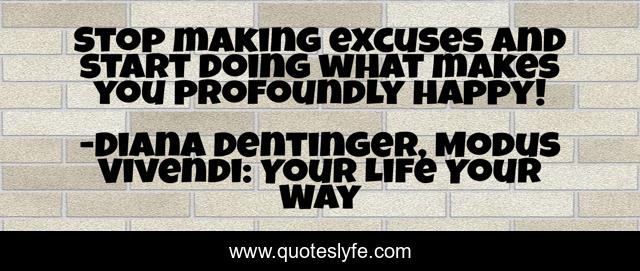 This page presents the quote "Stop making excuses and start doing what makes you profoundly happy!". Author of this quote is Diana Dentinger, Modus Vivendi: Your Life Your Way. This quote is about spiritual-growth, confidence, meaning-of-life, personal-growth, positive, motivational, life-purpose, optimistic, inspirational,.