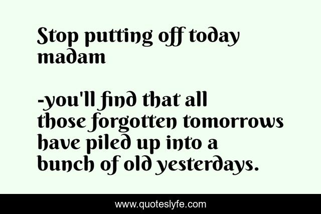 "you'll find that all those forgotten tomorrows have piled up into a bunch of old yesterdays. Quotes." Quoteslyfe.com, 2025. Sat. 06 Dec. 2025. <https://www.quoteslyfe.com/quote/Stop-putting-off-today-madam-141287>.