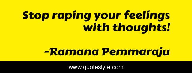 This page presents the quote "Stop raping your feelings with thoughts!". Author of this quote is Ramana Pemmaraju. This quote is about men, violence, emotional-atrocity, feelings, society, thoughts, women,.