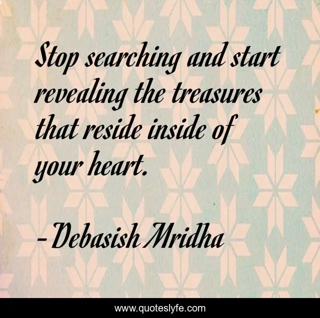 This page presents the quote "Stop searching and start revealing the treasures that reside inside of your heart.". Author of this quote is Debasish Mridha. This quote is about heart, philosophy, debasish-mridha, stop-searching, quotes, treasures, inspirational, enthusiasm, debasish-mridha-m-d,.
