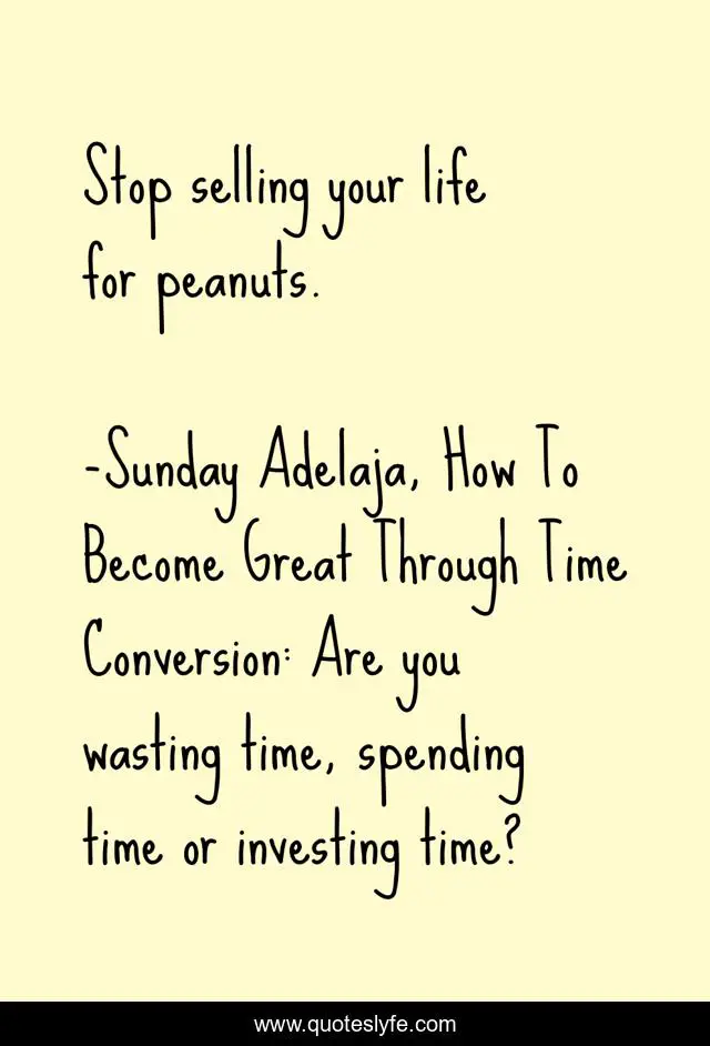 "Sunday Adelaja, How To Become Great Through Time Conversion: Are you wasting time, spending time or investing time? Quotes." Quoteslyfe.com, 2025. Fri. 05 Dec. 2025. <https://www.quoteslyfe.com/quote/Stop-selling-your-life-for-peanuts-39085>.