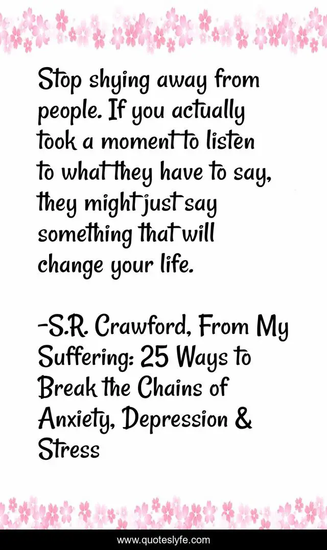 This page presents the quote "Stop shying away from people. If you actually took a moment to listen to what they have to say, they might just say something that will change your life.". Author of this quote is S.R. Crawford, From My Suffering: 25 Ways to Break the Chains of Anxiety, Depression & Stress. This quote is about stress, anxiety, life-crisis, mental-health-stigma, advice, mental-health, support, depression, inspiration,.