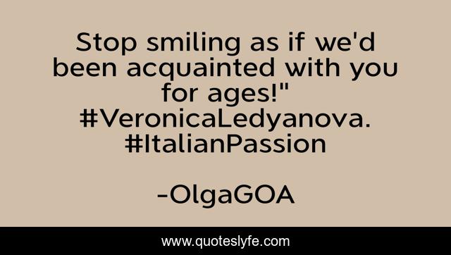 This page presents the quote "Stop smiling as if we'd been acquainted with you for ages!" #VeronicaLedyanova. #ItalianPassion". Author of this quote is OlgaGOA. This quote is about italy, english, books, russian-literature, book-worm, italian-literature, lovequotes, book, rome,.