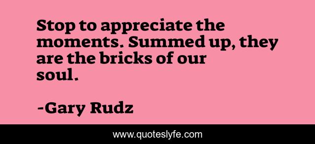 This page presents the quote "Stop to appreciate the moments. Summed up, they are the bricks of our soul.". Author of this quote is Gary Rudz. This quote is about moments, appreciate, soul,.