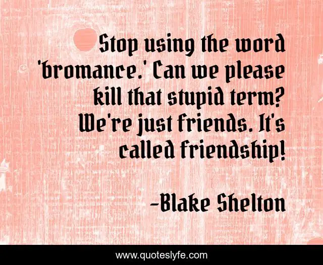 This page presents the quote "Stop using the word 'bromance.' Can we please kill that stupid term? We're just friends. It's called friendship!". Author of this quote is Blake Shelton. This quote is about friends, stupid, stop,.