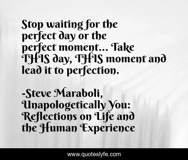 This page presents the quote "Stop waiting for the perfect day or the perfect moment... Take THIS day, THIS moment and lead it to perfection.". Author of this quote is Steve Maraboli, Unapologetically You: Reflections on Life and the Human Experience. This quote is about life, success, moment, perfection, action, carpe-diem, day, happiness,.