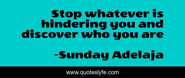 This page presents the quote "Stop whatever is hindering you and discover who you are". Author of this quote is Sunday Adelaja. This quote is about love, people, money, principles, worship, destiny, god, nature-of-god, image-of-god,.