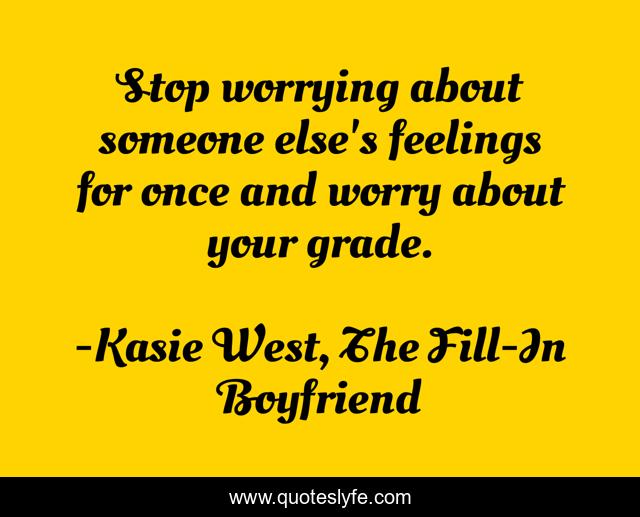 This page presents the quote "Stop worrying about someone else's feelings for once and worry about your grade.". Author of this quote is Kasie West, The Fill-In Boyfriend. This quote is about school, love, grade, feelings, worry, affection,.