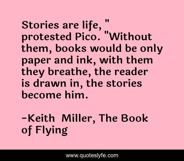 This page presents the quote "Stories are life, " protested Pico. "Without them, books would be only paper and ink, with them they breathe, the reader is drawn in, the stories become him.". Author of this quote is Keith Miller, The Book of Flying. This quote is about life, books,.