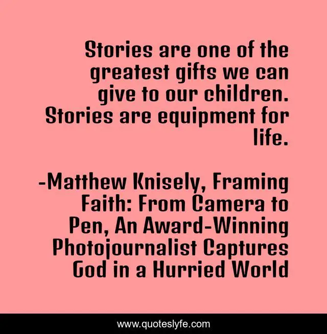 This page presents the quote "Stories are one of the greatest gifts we can give to our children. Stories are equipment for life.". Author of this quote is Matthew Knisely, Framing Faith: From Camera to Pen, An Award-Winning Photojournalist Captures God in a Hurried World. This quote is about faith, photography, spiritual-living, spiritual-life,.