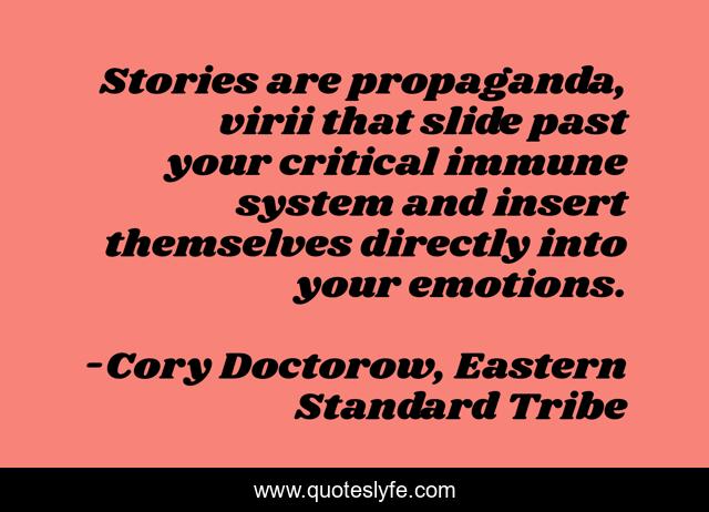 "Cory Doctorow, Eastern Standard Tribe Quotes." Quoteslyfe.com, 2025. Sun. 07 Dec. 2025. <https://www.quoteslyfe.com/quote/Stories-are-propaganda-virii-that-slide-past-180513>.