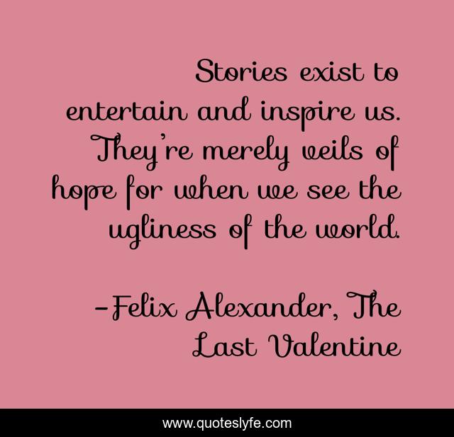 This page presents the quote "Stories exist to entertain and inspire us. They’re merely veils of hope for when we see the ugliness of the world.". Author of this quote is Felix Alexander, The Last Valentine. This quote is about inspiring, love, inspire, entertainment, uglyness, story, romance, entertain, stories,.
