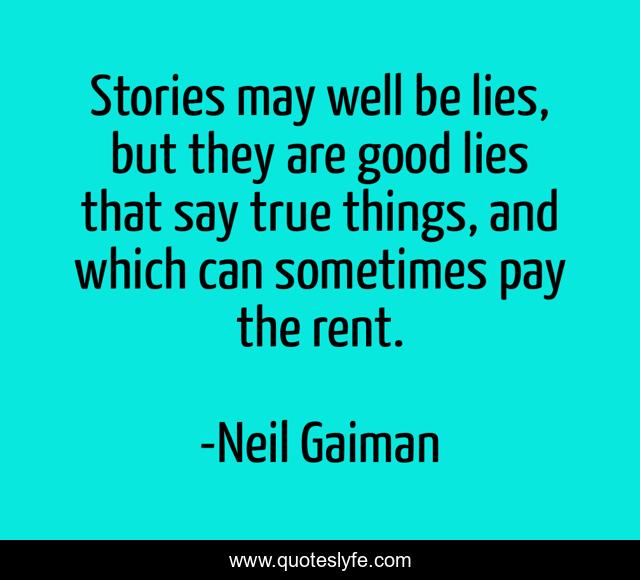 This page presents the quote "Stories may well be lies, but they are good lies that say true things, and which can sometimes pay the rent.". Author of this quote is Neil Gaiman. .