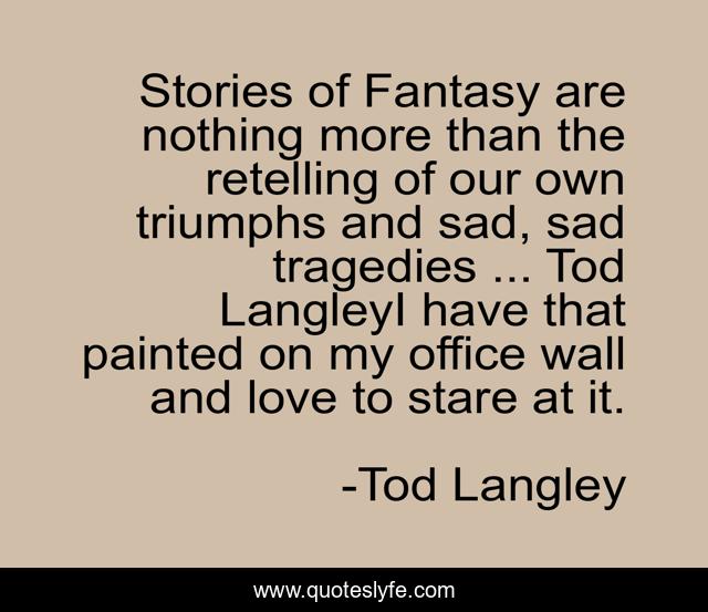 This page presents the quote "Stories of Fantasy are nothing more than the retelling of our own triumphs and sad, sad tragedies ... Tod LangleyI have that painted on my office wall and love to stare at it.". Author of this quote is Tod Langley. This quote is about fantasy, writer, magic, inspirational, enthusiasm,.