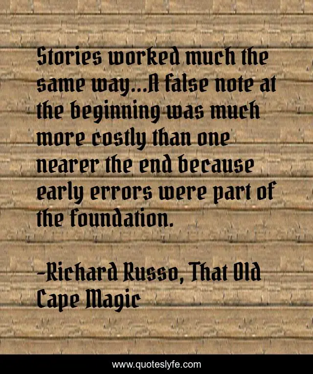 This page presents the quote "Stories worked much the same way…A false note at the beginning was much more costly than one nearer the end because early errors were part of the foundation.". Author of this quote is Richard Russo, That Old Cape Magic. .
