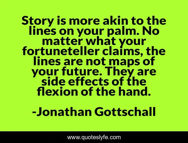 This page presents the quote "Story is more akin to the lines on your palm. No matter what your fortuneteller claims, the lines are not maps of your future. They are side effects of the flexion of the hand.". Author of this quote is Jonathan Gottschall. .