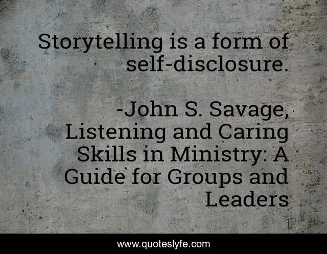 "John S. Savage, Listening and Caring Skills in Ministry: A Guide for Groups and Leaders Quotes." Quoteslyfe.com, 2025. Fri. 05 Dec. 2025. <https://www.quoteslyfe.com/quote/Storytelling-is-a-form-of-self-disclosure-219006>.