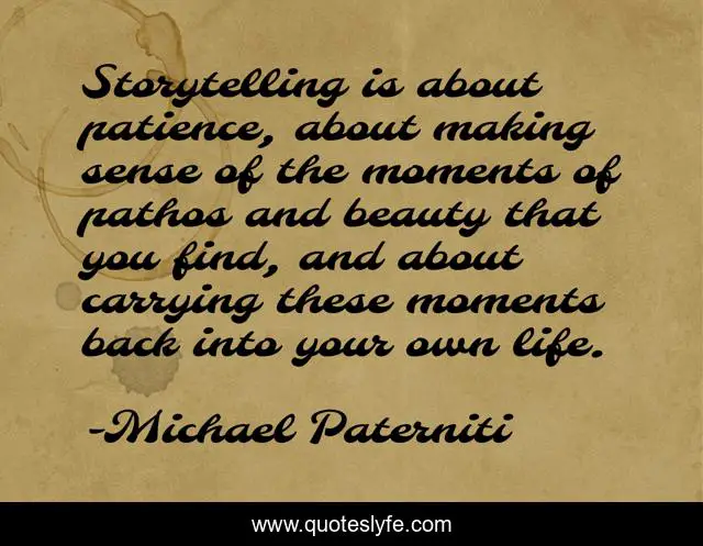 This page presents the quote "Storytelling is about patience, about making sense of the moments of pathos and beauty that you find, and about carrying these moments back into your own life.". Author of this quote is Michael Paterniti. This quote is about moments, life, beauty,.