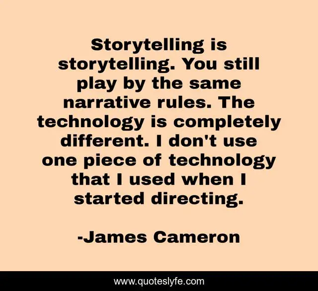 This page presents the quote "Storytelling is storytelling. You still play by the same narrative rules. The technology is completely different. I don't use one piece of technology that I used when I started directing.". Author of this quote is James Cameron. This quote is about rules, play, storytelling,.