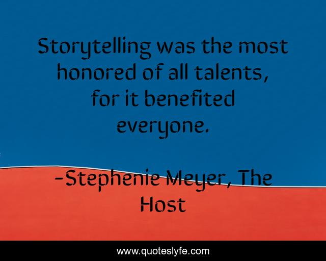 This page presents the quote "Storytelling was the most honored of all talents, for it benefited everyone.". Author of this quote is Stephenie Meyer, The Host. This quote is about story, talents, storytelling,.