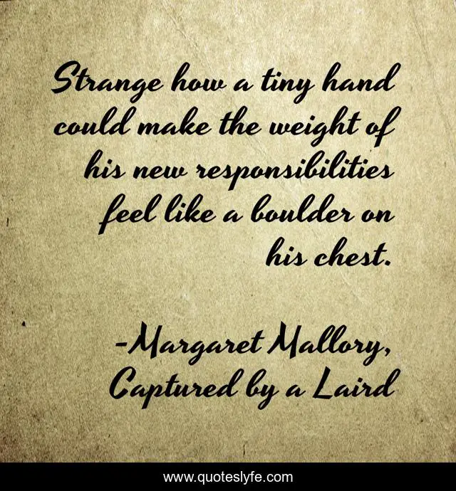 This page presents the quote "Strange how a tiny hand could make the weight of his new responsibilities feel like a boulder on his chest.". Author of this quote is Margaret Mallory, Captured by a Laird. This quote is about historical-romance, scottish-romance,.