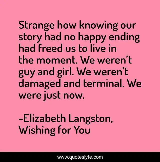 This page presents the quote "Strange how knowing our story had no happy ending had freed us to live in the moment. We weren’t guy and girl. We weren’t damaged and terminal. We were just now.". Author of this quote is Elizabeth Langston, Wishing for You. This quote is about grief, disability, illness, friendship,.
