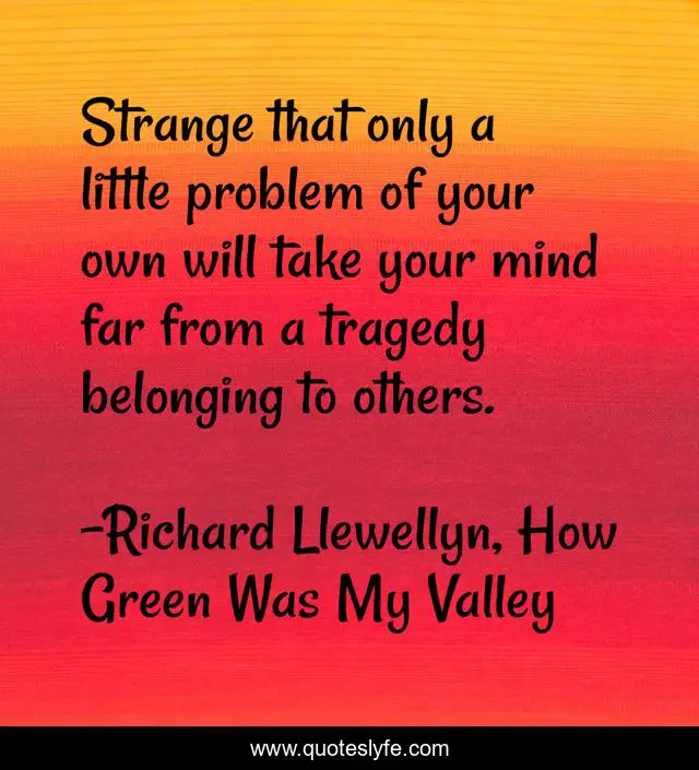 This page presents the quote "Strange that only a little problem of your own will take your mind far from a tragedy belonging to others.". Author of this quote is Richard Llewellyn, How Green Was My Valley. This quote is about compassion, selfishness, preoccupation,.