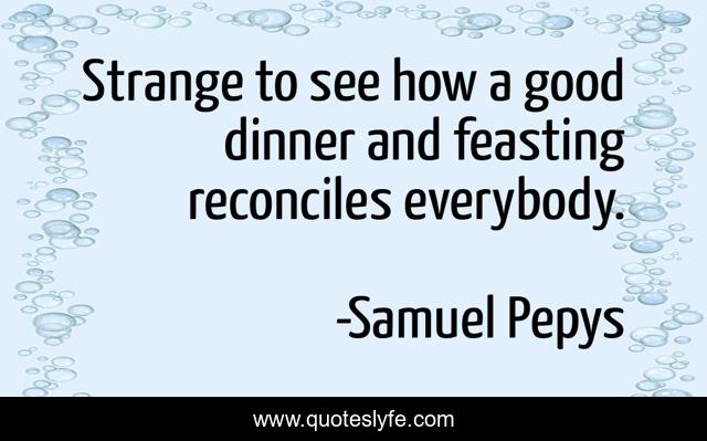 This page presents the quote "Strange to see how a good dinner and feasting reconciles everybody.". Author of this quote is Samuel Pepys. This quote is about dinner, good, strange,.