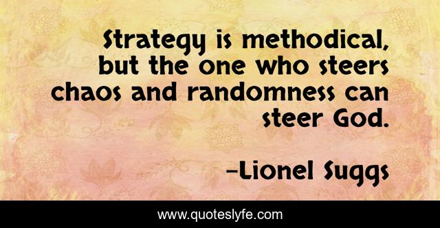 This page presents the quote "Strategy is methodical, but the one who steers chaos and randomness can steer God.". Author of this quote is Lionel Suggs. This quote is about god, randomness, chaos, strategy,.