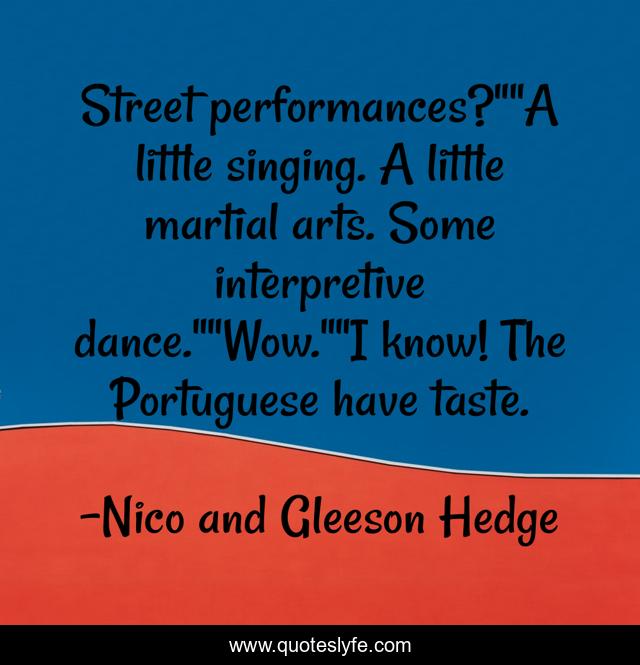 This page presents the quote "Street performances?""A little singing. A little martial arts. Some interpretive dance.""Wow.""I know! The Portuguese have taste.". Author of this quote is Nico and Gleeson Hedge. This quote is about performance, percy-jackson, humor, blood-of-olympus,.
