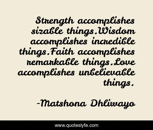 "Matshona Dhliwayo Quotes." Quoteslyfe.com, 2025. Sat. 06 Dec. 2025. <https://www.quoteslyfe.com/quote/Strength-accomplishes-sizable-things-Wisdom-accomplishes-incredible-98406>.